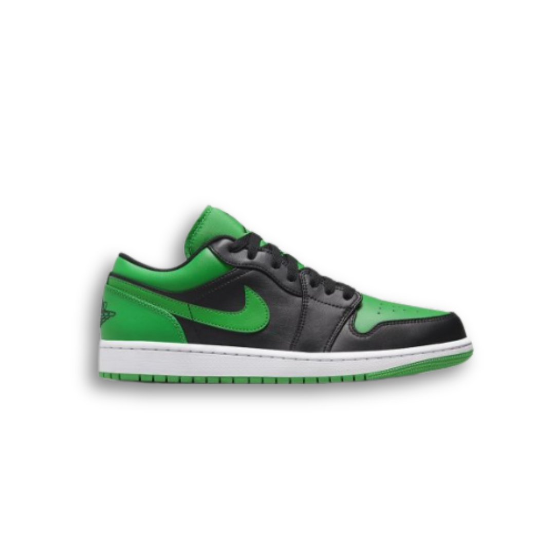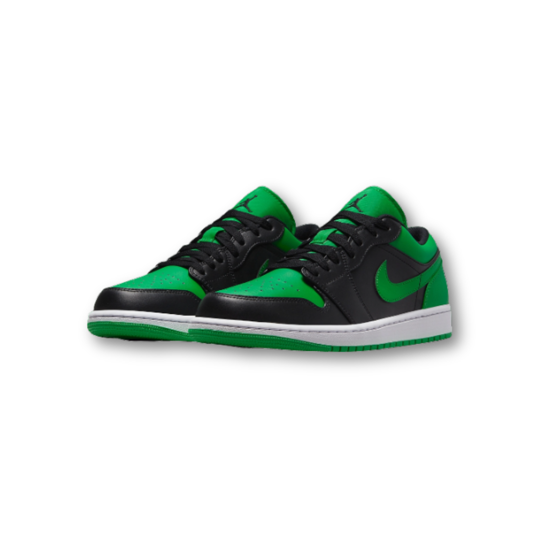 The Jordan 1 Low Lucky Green (GS) delivers a bold, energetic update to the classic low-top silhouette. Featuring a smooth black leather base contrasted with vibrant Lucky Green overlays and crisp white accents, this colorway offers a clean and sporty look inspired by Michael Jordan’s Chicago heritage. Finished with the iconic Wings logo on the heel and a durable rubber outsole, this pair combines timeless style with everyday comfort.