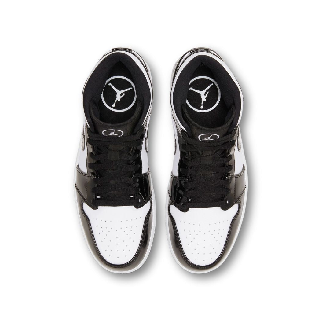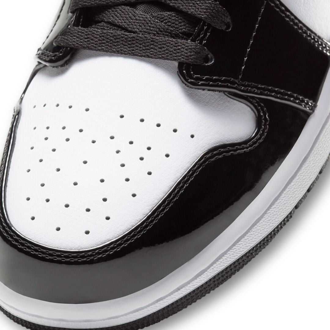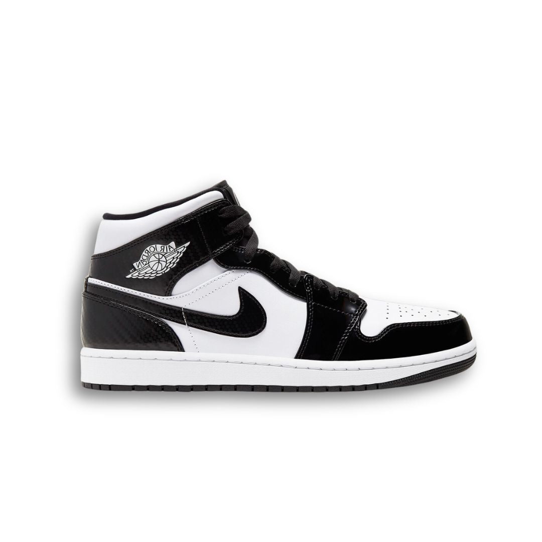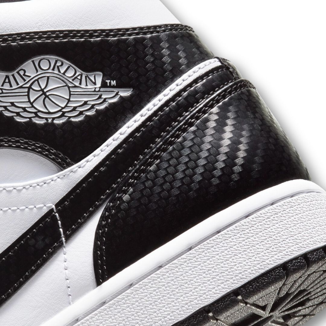 The Air Jordan 1 Mid “Carbon Fiber” stands out with a sleek, high-gloss patent leather upper and carbon fiber detailing that adds a futuristic touch. Dressed in black and white with subtle hits of metallic texture, this special edition was released during NBA All-Star Weekend 2021. The shoe keeps it classic with the Wings logo on the collar, a white midsole, and a durable black rubber outsole.