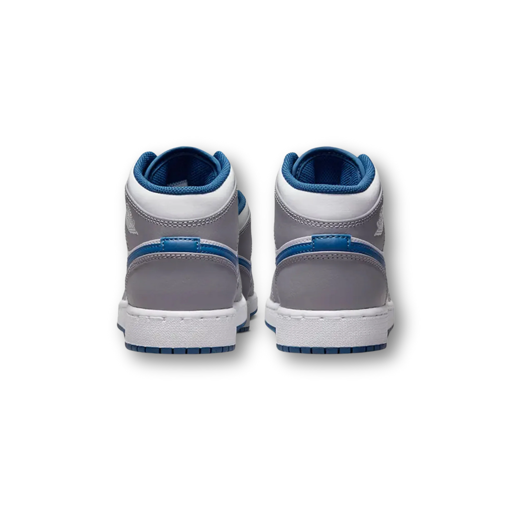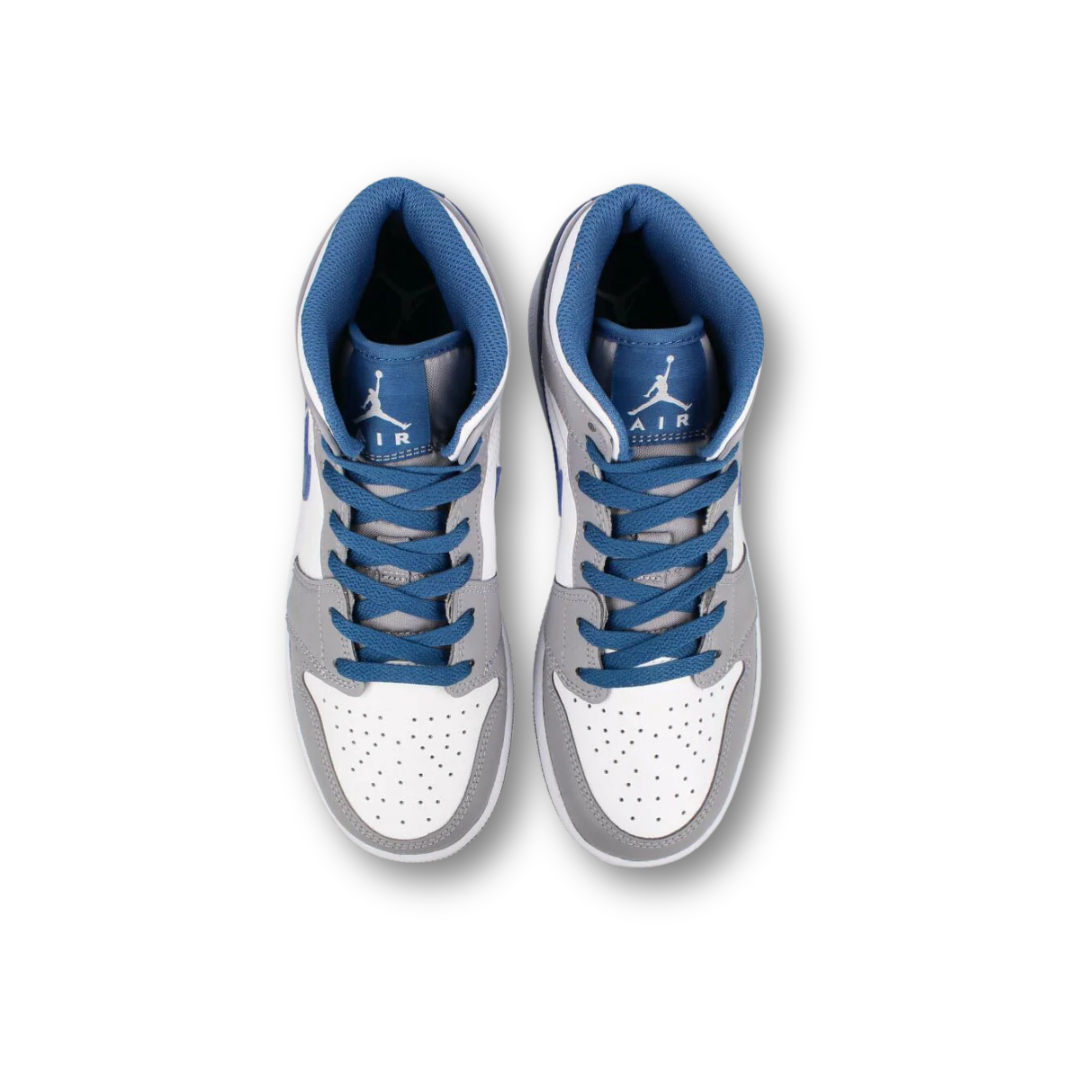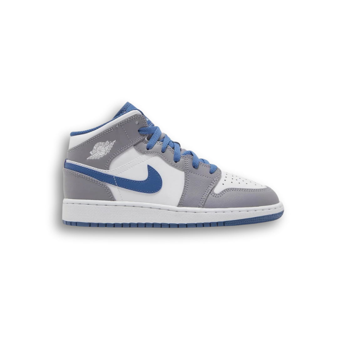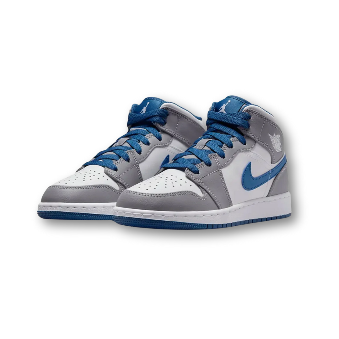 The Jordan 1 Mid True Blue Cement (GS) delivers a bold and versatile look for younger sneaker fans, combining classic Jordan heritage with a vibrant colorway. Featuring premium leather construction, the upper showcases Cement Grey and White panels contrasted by striking True Blue overlays, creating a dynamic and eye-catching design. The mid-top silhouette provides ankle support and comfort, while the rubber outsole ensures durable traction. Finished with iconic Wings and Swoosh branding, this GS edition merges timeless Jordan style with a playful pop of color.