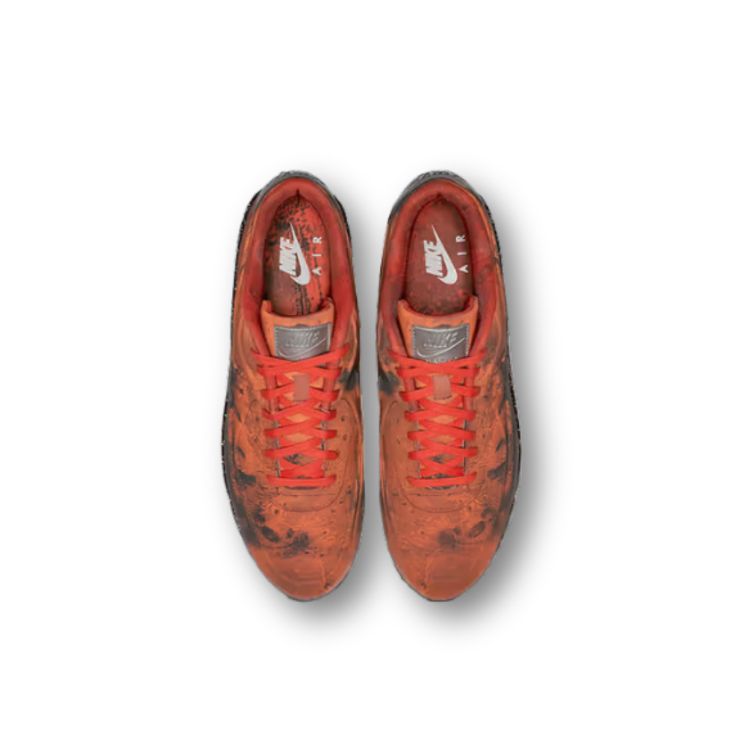 The Nike Air Max 90 “Mars Landing” is a space‑inspired reinterpretation of the classic silhouette, featuring a striking all‑over graphic influenced by actual Mars surface imagery. The upper is made from reflective 3M material that shimmers like a starry sky. Magma Orange detailing on the tongue, inner lining, and laces adds vivid contrast, while the black midsole speckled with metallic paint evokes the rugged terrain of the Red Planet. The outsole pattern mimics Mars rover tire treads, completing the lunar landing concept with a clever touch.